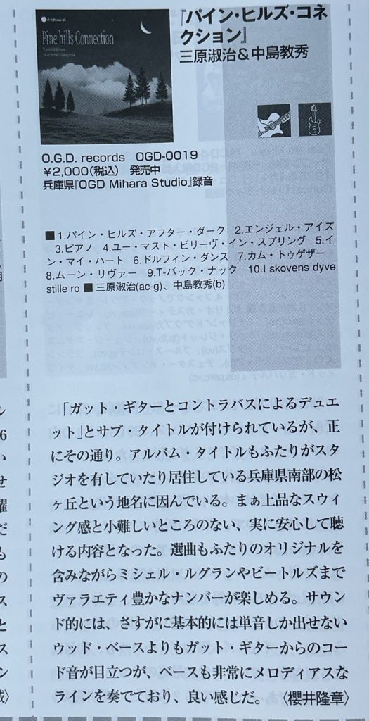 先日リリースしたベース中島教秀とのデュオアルバム「Pinehills connection」のレビューがJazz life1月号に掲載されていました。中島君は大学軽音の後輩ですから長い付き合いですがデュオで演奏するのは今年の春頃に豊中の我巣灯でやったのが初めて。それが非常に心地よかったので記録として置いておこうかということで夏に2回ほど集まって録音したものです。